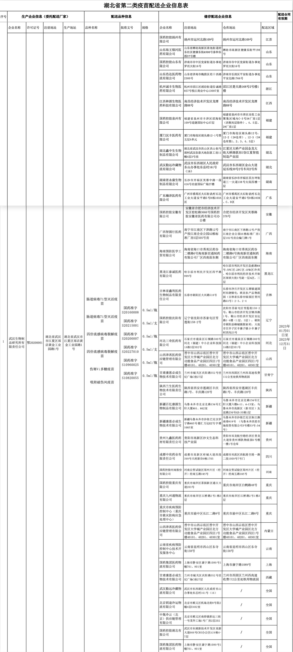 湖北省第二類疫苗配送企業(yè)信息表