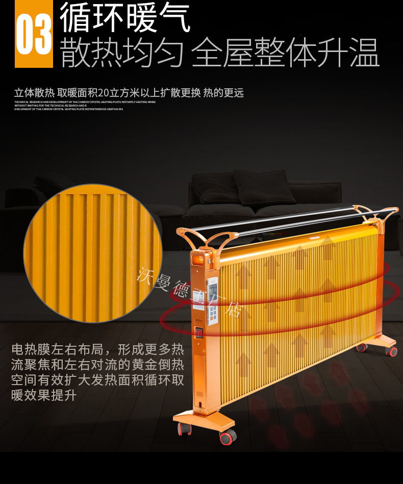 碳晶原子以“布朗運動”原理為基礎(chǔ)通過遠紅外制熱,熱轉(zhuǎn)換率可達99.8%。,全面散熱,比普通的電暖器熱量提高1倍,帶萬向輪底座,膨脹螺絲,壁掛,移動,方便好用,讓室內(nèi)不在干燥。